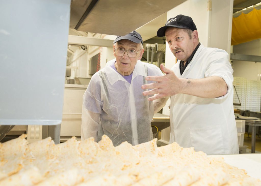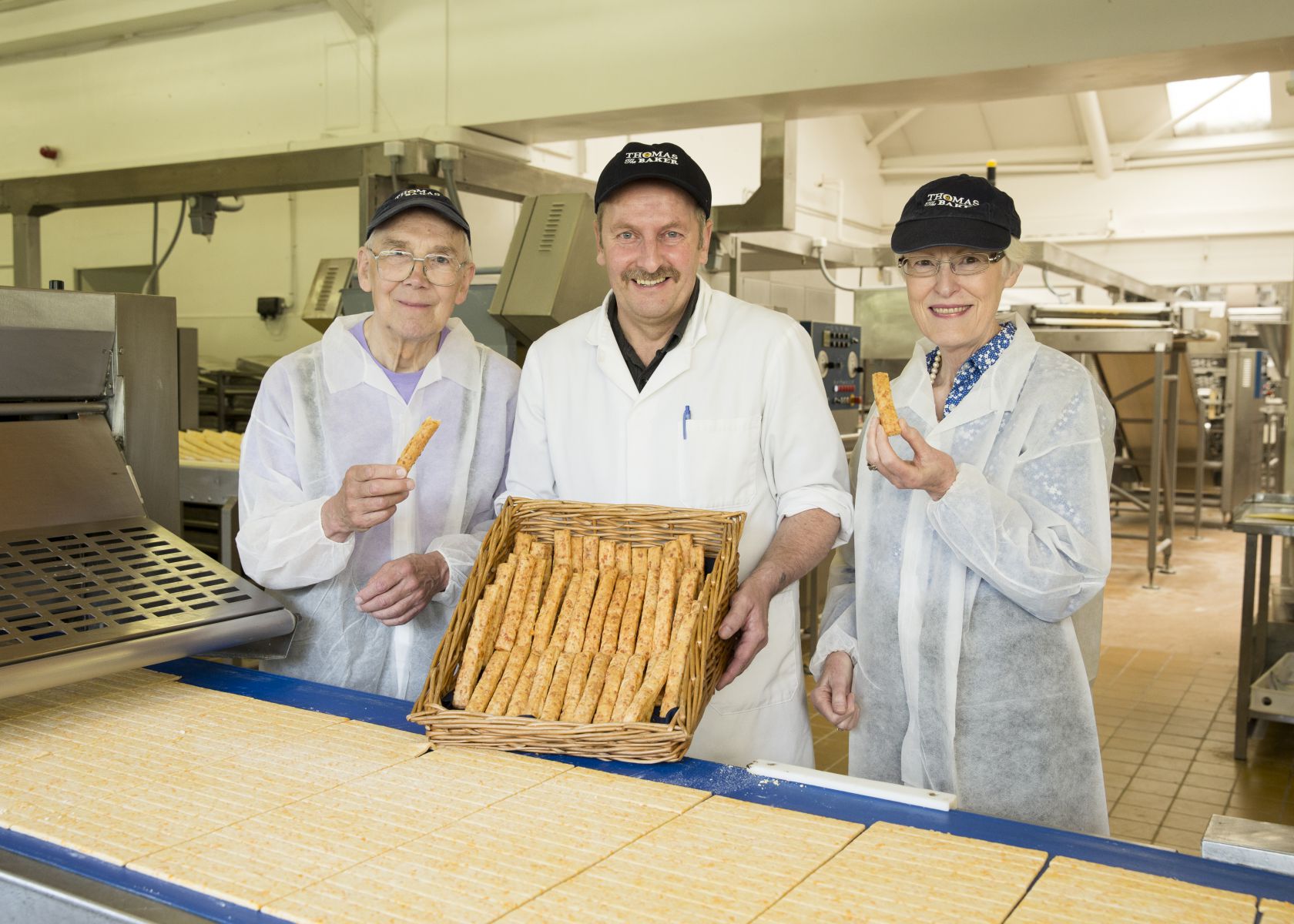 Tony has kept in contact, providing details of how well the baking instructions fare and whether it’s all up to his usual explanations. And earlier this year, he and his wife made the trip themselves to our bakery in Helmsley to meet the people who had made it possible for him to get his favourite treat despite living hundreds of miles away. Above Chris Chapman, Quality Assurance Manager, shows him how the cheese straws are produced on a tour of the bakery.